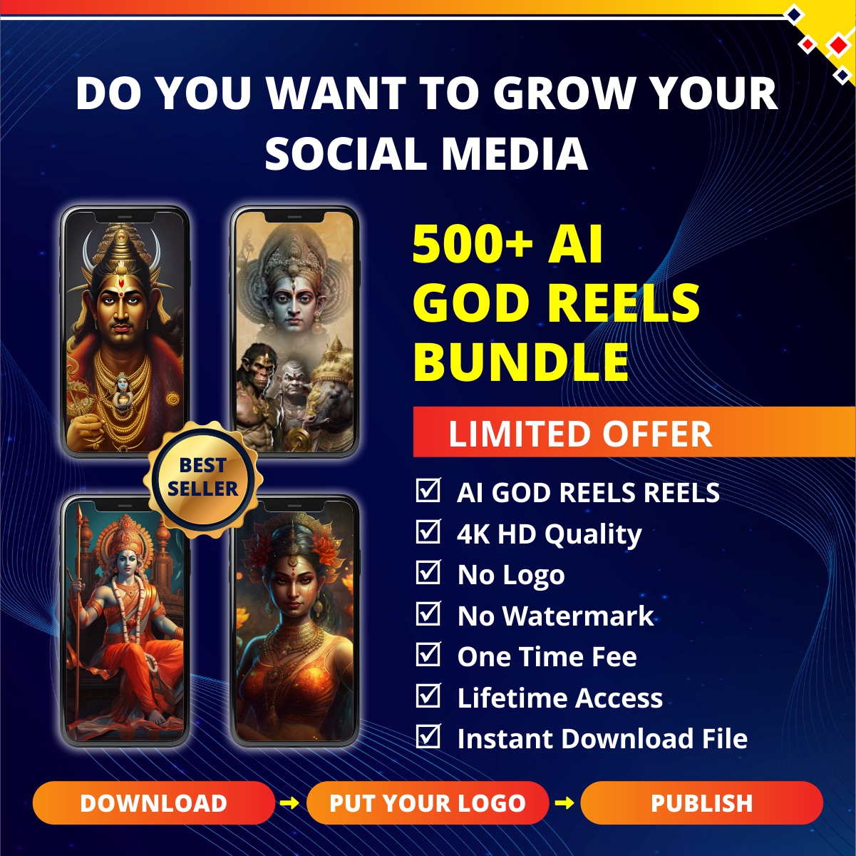 Are you looking to boost your social media presence? Get the 500+ AI Hindu God Reels Bundle. Simply download, add your logo, and publish.